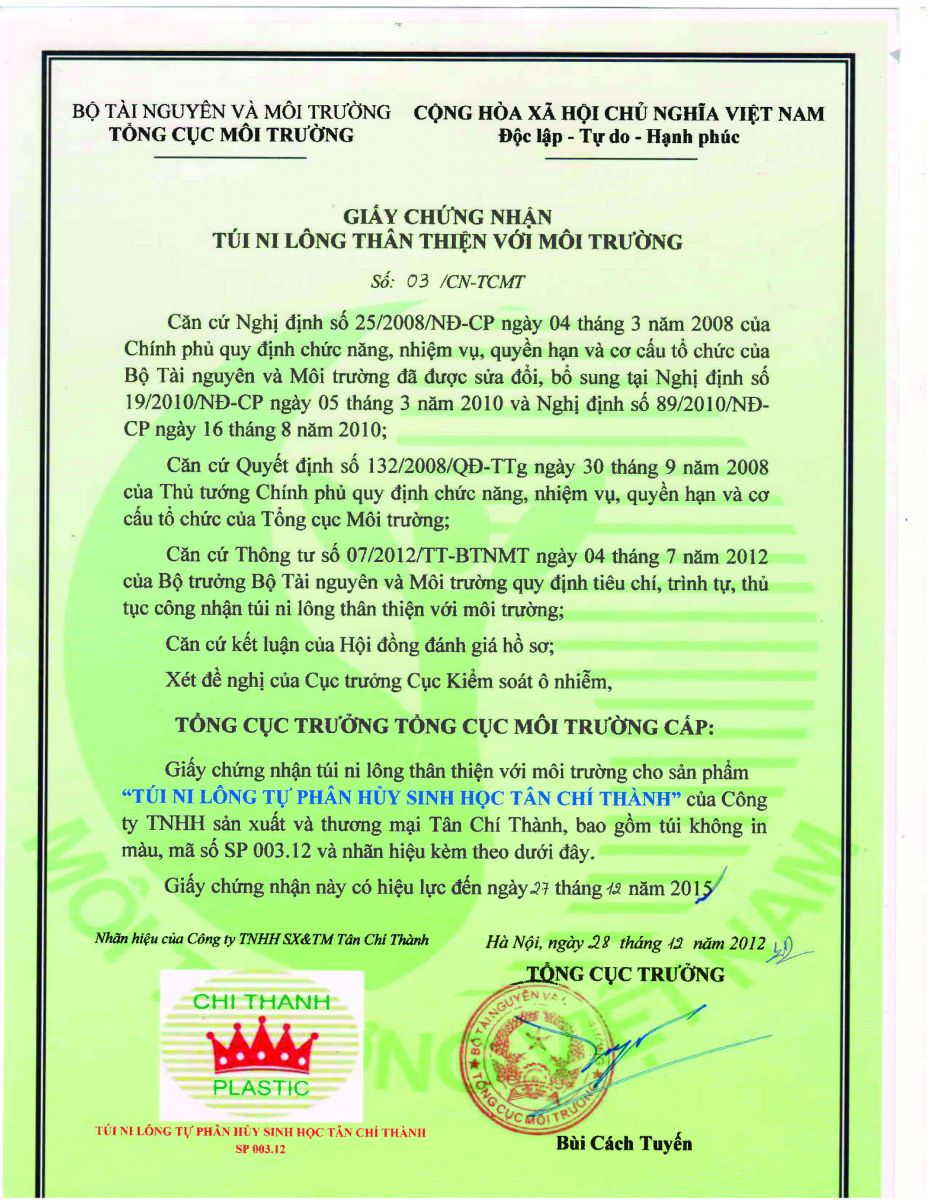 Vừa qua, công ty Tân Chí Thành đã được bộ tài nguyên môi trường chính thức cấp giấy chứng nhận sản phẩm túi ni lon thân thiện môi trường.